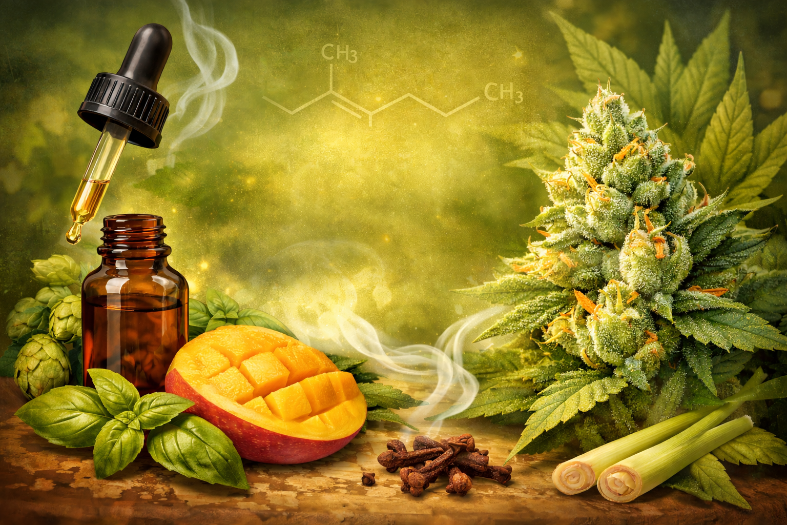 Myrcene is a naturally occurring terpene found not only in cannabis, but also in mangoes, hops, lemongrass, and thyme. In cannabis, it’s commonly associated with earthy, musky, herbal aromas and sometimes subtle fruity undertones.