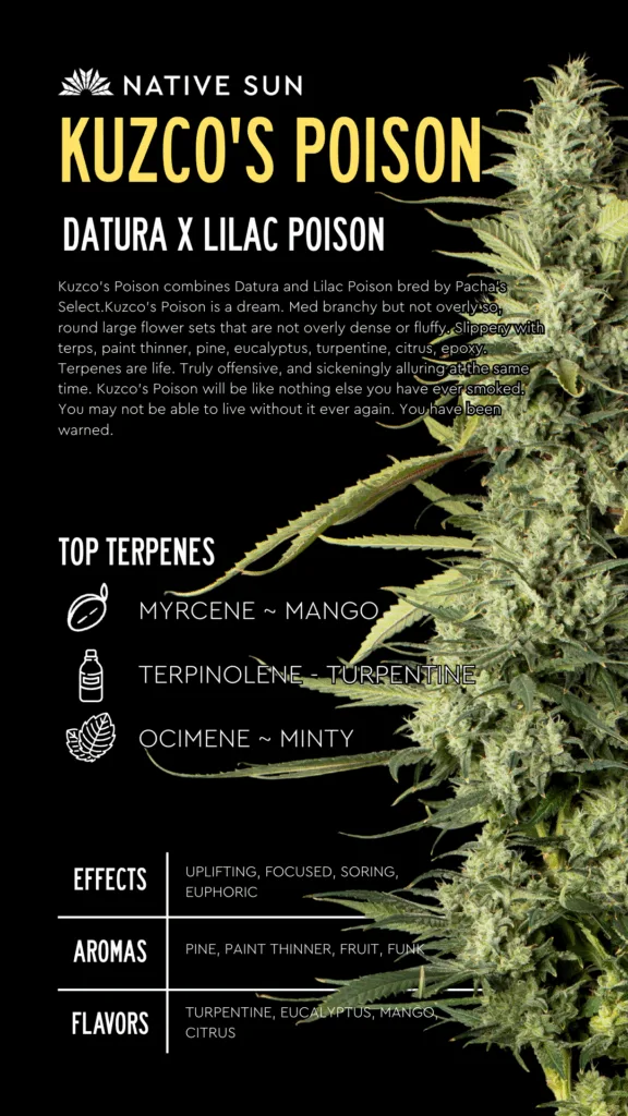 Kuzco’s Poison is Native Sun’s wild-card summer sativa. This terp-heavy cultivar is built for bold flavor, elevated vibes, and peak-summer energy. Bred by Pacha’s Select and cultivated to perfection by Native Sun, this infamous strain explodes with wild, sometimes deliciously offensive, even chaotic aromatic notes. Think layered pine, fruit, citrus, turpentine, eucalyptus, and a hint of epoxy, colliding in an unforgettable sensory experience as vibrant and untamed as a steamy July afternoon.